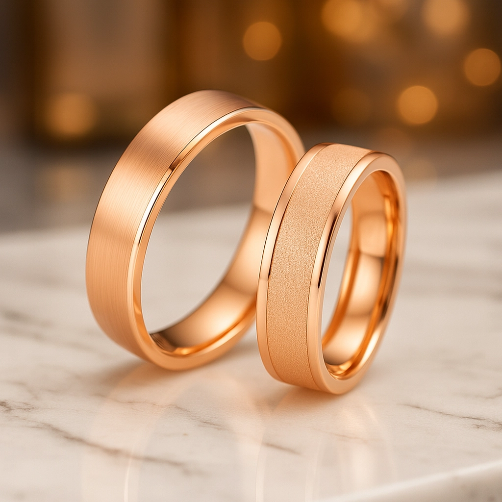 14 Ayar Rose Altın Mat ve Fırçalı Yüzey Detaylı Klasik Alyans Çifti, romantizmi ve modern şıklığı bir araya getiren zarif tasarımıyla öne çıkar. Erkek modelinde fırçalı yüzey detayı kullanılarak sofistike bir görünüm sağlanırken, kadın modelinde mat dokulu yüzey sayesinde sade ve göz alıcı bir estetik oluşturulmuştur. Bu farklı ama uyumlu tasarım, çiftlerin birbirini tamamlayan özel bağını simgeler.