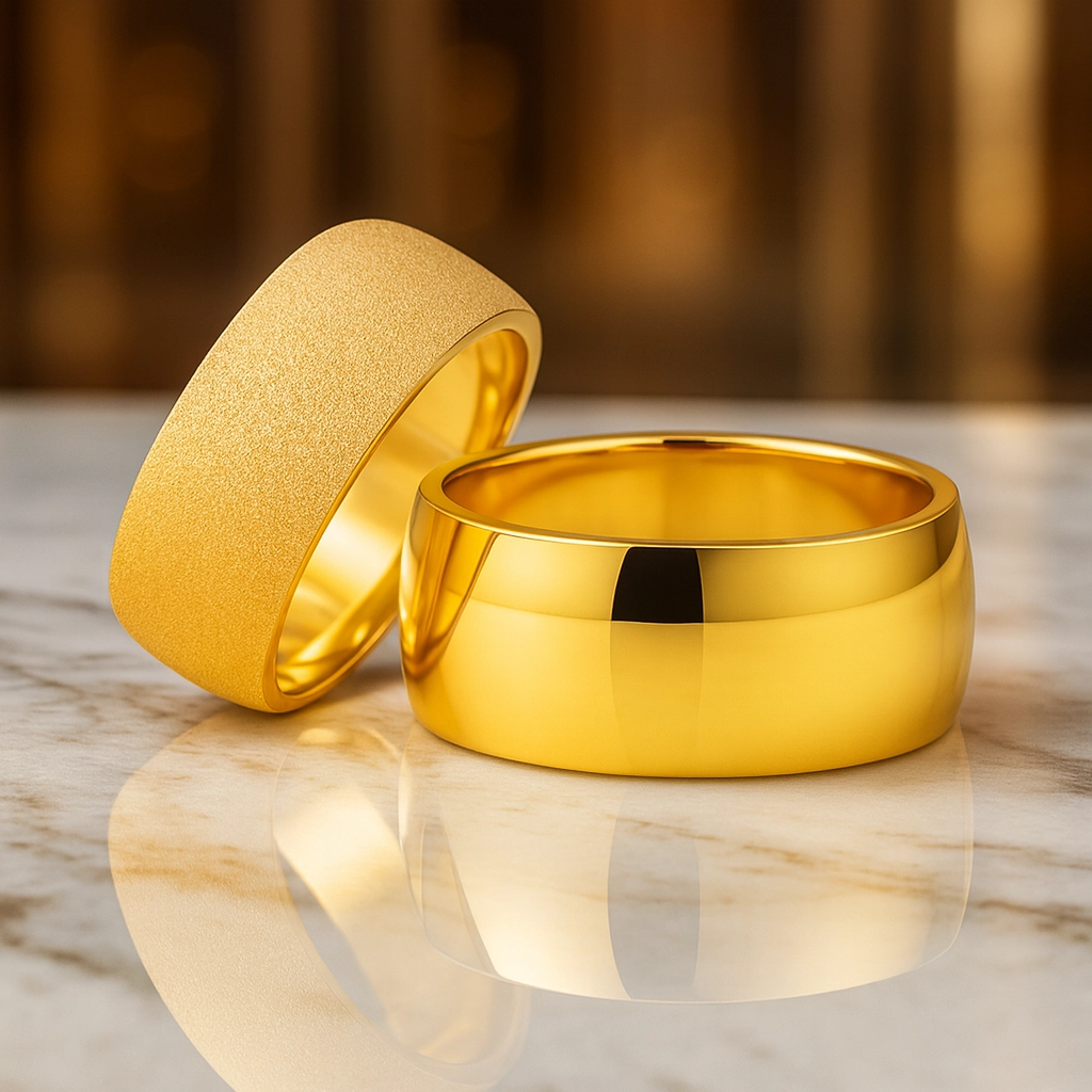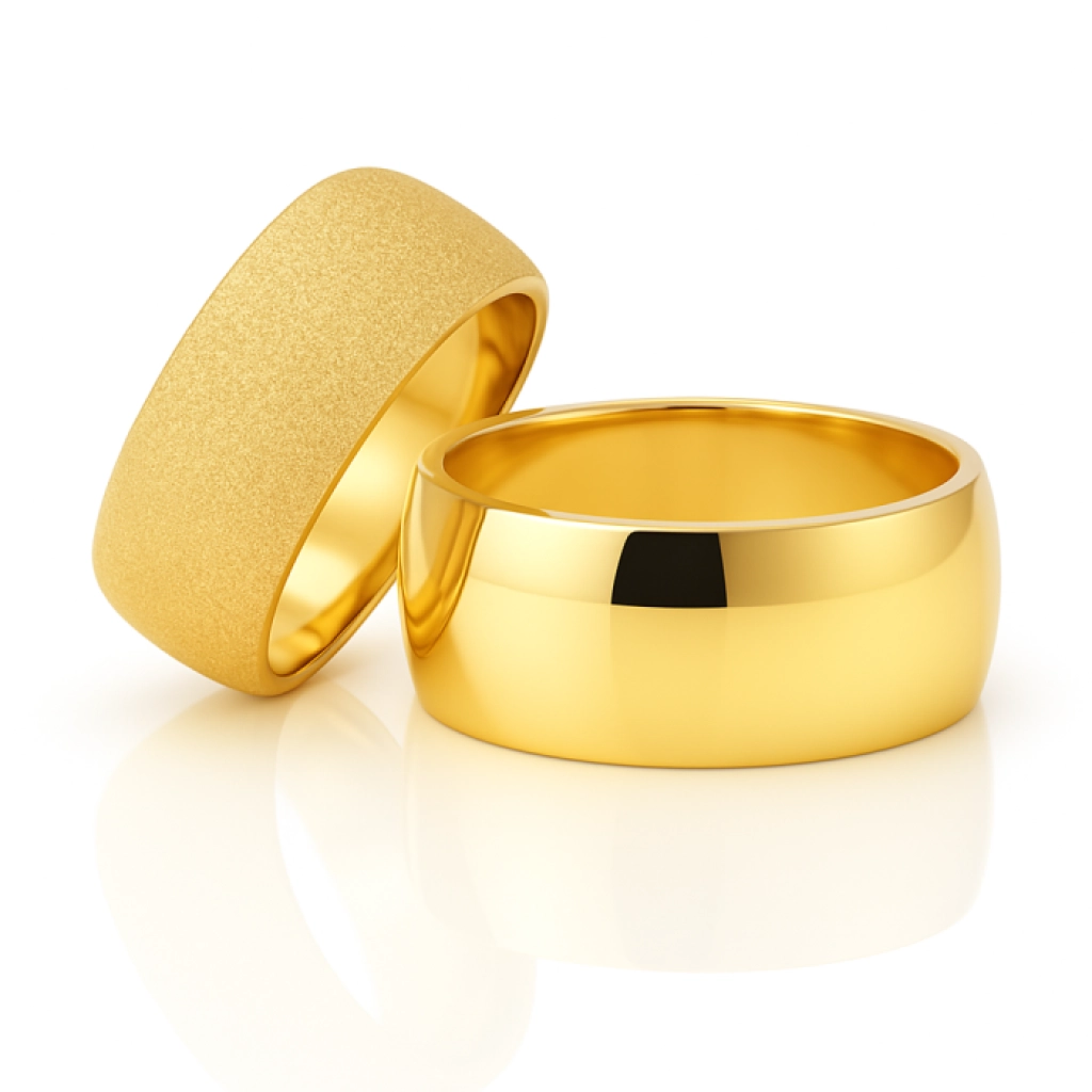 14 Ayar Sarı Altın Bombeli & Mat Alyans Çifti, klasik şıklığı ve modern dokunuşları bir araya getiriyor. Kadın modeli, zarif mat yüzeyiyle minimal bir duruş sergilerken; erkek modeli bombeli ve parlak yapısıyla göz alıcı bir şıklık sunar.