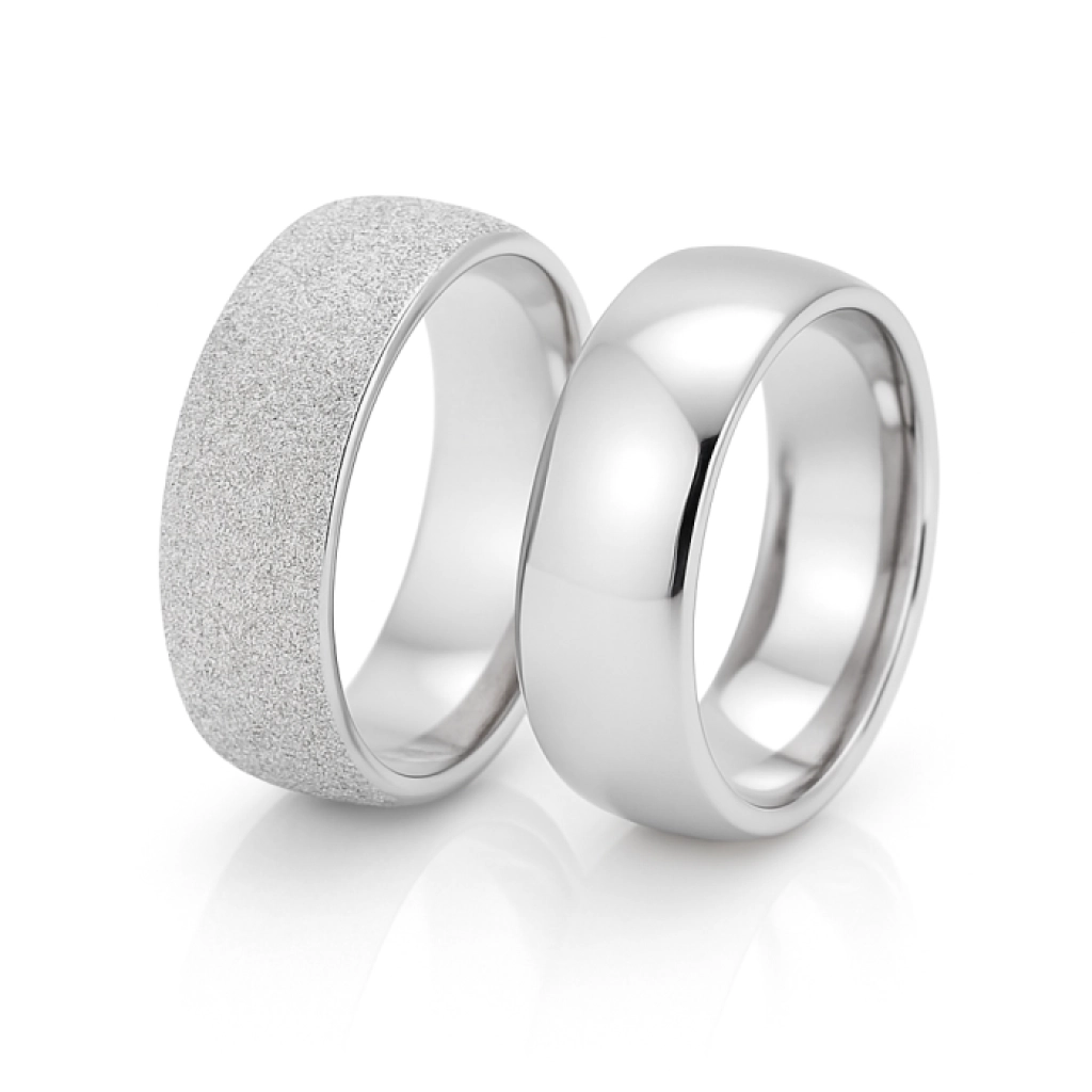 Beyaz Altın 8 mm Çift Yüzeyli Modern Alyans Çifti, şıklığı ve zarafeti aynı anda sunar. Parlak yüzeyli erkek alyansı ile mat taş dokulu kadın alyansının birleşimi, modern ve sofistike bir uyum ortaya çıkarır.
